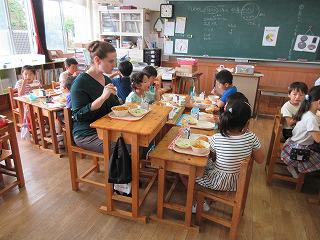 2年生の給食の様子(ALTのセーラ先生との会食)