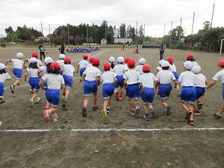 2校時は、1・2・3年生が一緒に準備運動をして、2年生が最初に走りました。
