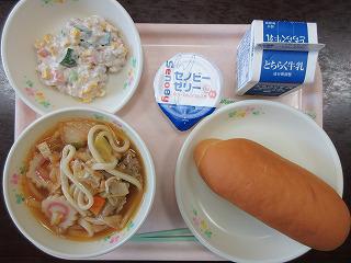 献立は「ミルクパン、牛乳、キムチうどん、ツナと大豆のサラダ、セノビーゼリー」です。