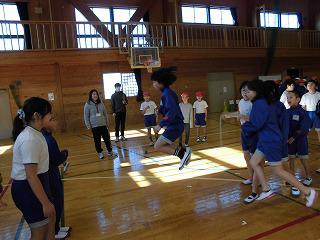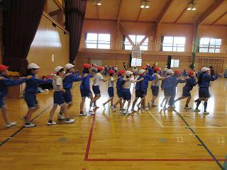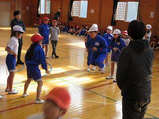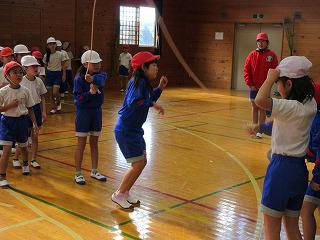 1年生にとって、初めて参加するなわとび集会でした。続けて跳べるように、体育の授業や昼休みなどに練習をしてきました。縄を回すのは先生方で、回る縄を見ながらタイミングよく跳んでいました。よくがんばりました。