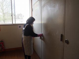 学校では、毎日全職員でドア、ドアノブ、トイレ、階段の手すりなど多くの人が触れるところを次亜塩素酸ナトリウムの希釈液で消毒しています。