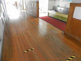 また、こまめな手洗いやうがいの指導をしていますが、手洗い場の数に限りがあるため、手洗い等の順番を待っている間児童同士が密集しないよう、廊下に印を付け間隔をあけるようにしています。