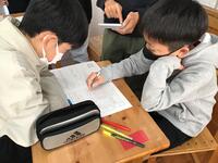 教科書にラインを引きながら読み大切なことを短い文で表し、それぞれに考えたものを友達と確認し合って修正しています。