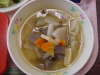 今日の給食の献立は、ごはん、牛乳、ハンバーグおろしソースがけ、ブロッコリー、田舎汁です。
