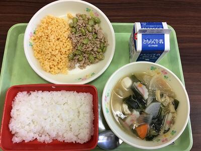 まずは三食丼です。この卵そぼろ!実は、調理員さんの手作りです。(これって本校だけではないでしょうか。通常は「業務用卵そぼろ」が多いようです。)これは、卵だけきちんと味わう必要がありそうです。