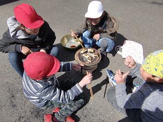 今日の2・3校時に3年生が昔の道具を使う学習を行いました。七輪を使って火をおこし、お餅を焼きました。すぐに火がついてしまうグループもありましたが、なかなか火がつかなくて悪戦苦闘するグループもありました。他の学年の子達がうらやましそうに通り過ぎていくのを尻目においしそうに焼き上がったおもちをほおばっていました。昔の道具は大変だけど、おいしくできると口々に言っていました。