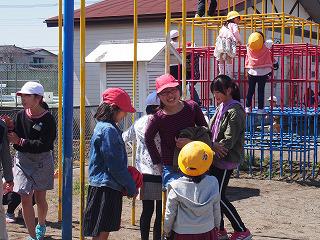 暖かい日差しの中、子どもたちは元気に遊んでいます。今日は5年生の身体計測のためC日課で、長い業間休みがありました。6年生が1年生の遊び相手になってあげています。1年生もすっかり校庭に慣れて、元気いっぱい走り回っていました。