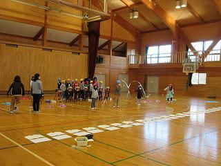 体育館で長縄跳びの練習です。水道管の断熱材を使った長縄は、太くて白い縄です。回転がゆっくりで子どもたちによく見えるので、練習するのに最適です。