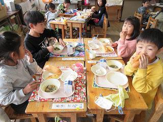 「フルーツクリームドッグ、牛乳、オムレツ、ミートボールスープ」です。クリームがどっさりのったパンを大きな口を開けて頬張っていました。1年生は、意外や意外。オムレツドッグにしている子どもたちが多かったです。フルーツクリームはデザートですね。