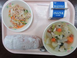 「ミルク揚げパン、牛乳、白菜とツナのサラダ、ポトフ」です。スキムミルクとパウダークリームをまぶした白い揚げパン、子どもたちは目を輝かせて食べていました。