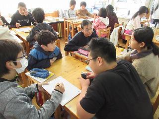 英語の発音を重視した指導ジョリーフォニックスによる指導が行われていました。ALTの先生が発音する単語を聞いた後、子どもたちが相談しながらボードに表記していました。