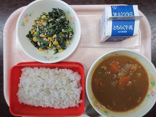 「麦ごはん、牛乳、ポークカレー、ほうれん草とコーンとツナのサラダ」です。今日から、食べ物クイズが始まりました。「ほうれん草が一番おいしくて栄養がたっぷりになる季節は、春、秋、冬のどれですか?」でした。