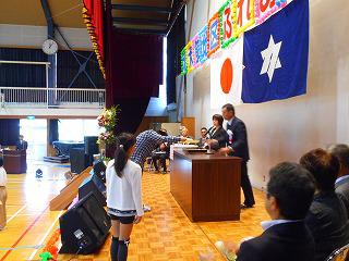 20日(日)北犬飼中体育館において、子どもの作品展並びに篤行善行児童生徒の表彰式がありました。関係学校の児童生徒の代表や該当者が出席し、会長さんから表彰を受けました。津田小からも、3名の児童が立派な態度で賞状を受け取っていました。