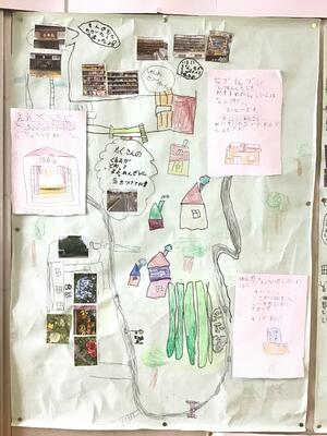 こちらは2年生、「まちたんけん」で調べたことを地図にまとめました。いろんな出会いがあり、すばらしい体験になった「まちたんけん」でした。2年生たちは、お礼の手紙なども作成中です。