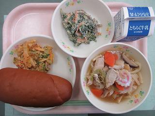 「減量黒パン、牛乳、かき揚げ、五目うどん、白和え」です。かき揚げなどの天ぷら、480年ほど前にある国から伝わった料理だそうです。今日のたべものクイズは、その国の言葉「テンポラ」から天ぷらという言葉に変わったと言われているその国はどこでしょう?