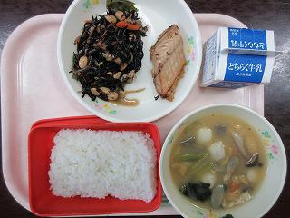 和食の王道「ごはん、牛乳、サバのスタミナ焼き、五目煮、いなか汁」です。今日のたべものクイズは、五目煮に入っている真っ黒なひじき、海の中ではどんな色をしているかという問題でした。