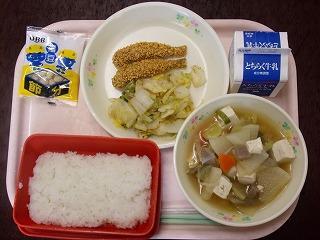 節分の今日の献立は、ごはん、牛乳、イワシのカリカリフライ、おひたし、鶏ゴボウ汁、福豆です。