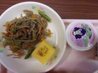 今日の給食の献立は、ごはん、牛乳、とちまるくん卵焼き、五目きんぴら、かんぴょうのみそ汁、県民の日ゼリーです。
