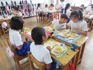 本日の献立は「ごはん、牛乳、タコライス、もずくスープ、シークワーサーゼリー」です。初めて給食に登場したタコライスは、メキシコ料理のタコスをアレンジしたもので、沖縄県で誕生したものだそうです。ごはんの上に、ゆでたキャベツをのせて、その上にスパイシーなタコミートをのせて食べます。子どもたちは、蛸がない!?と不思議そうでした。