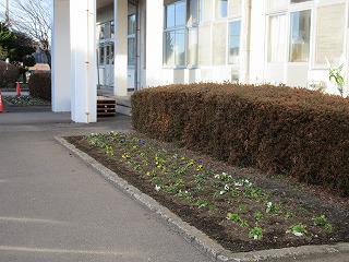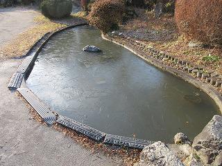 今朝は冷え込みました。男体山も麓の方まで雪化粧です。むつみ園の池もご覧の通り、厚めの氷が張りました。花壇のパンジーも、背中を丸めてこの寒さに耐えているようです。