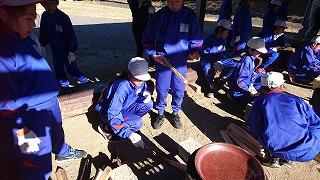 午前中の活動は塩作り・つぼ焼き芋作りです。海岸で汲んだ海水を直火で煮詰めて塩を作ります。1リットルの海水からとれる塩は約3グラム。薪に火が点かずに苦労した班もありましたが、大部分の水が蒸発して水が白く濁ってくると、あとはあっという間に塩がわき出るように出来てきます。さつまいもも美味しく焼き上がりました。