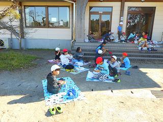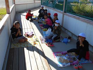 野外給食です。献立は「やきそば、牛乳、ブロッコリー、ハンバーグ、チーズドック」です。暖かな陽気で、外で給食を食べるのには絶好のコンディションです。なかよし班ごとに分かれて、思い思いの場所で食べました。調理員さんは、焼きそばを一人ずつパックに詰めるので、時間とのたたかいだったそうです。