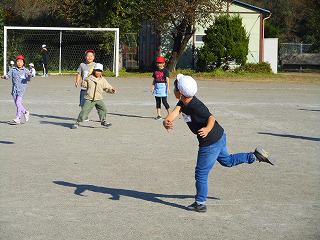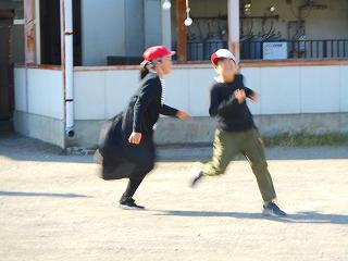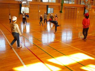 野外給食の後は、30分間の長い昼休みを使って、班ごとに考えた遊びの時間です。体育館はドッジ・ビー、校庭はドッジボール、三本線、ケイドロで遊んでいました。