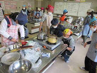 調理実習です。ごはんの炊き上がりを音で確かめたり、みそ汁の具を切ったりしていました。空いた時間に食器やお箸を洗ったり、油揚や長ネギを交代して切ったりして、仲良く調理実習を進めていました。ごはんもおいしく炊き上がり、煮干しで出汁をとったみそ汁も香りよくできあがりました。お米の研ぎ方がよかった、長ネギの切り方が上手だったとほめ合いながら、楽しそうに試食する姿が微笑ましく感じられました。