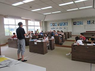 4年1組は音楽室を使っての授業でした。4文字の言葉「おまつり」を短く切って「おまつり(休み)おまつり(休み)」言葉を伸ばして「おーまーつーりー」などのリズムパターンをもとに、てリズムアンサンブルの楽しさを味わう授業でした。3、4人のグループに分かれて、教科書以外の4文字言葉を考えて(例:おんがく、しまねこ、など)練習し、発表しました。