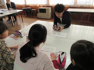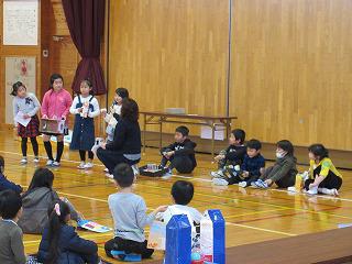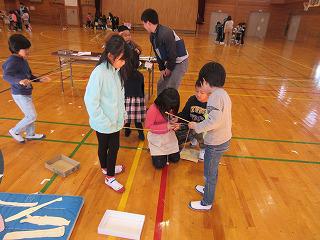 「おもちゃ大会」に、1年生と津田保育園の年長児さんを招待して、各グループで考えたおもちゃで遊んでもらいました。一つ一つが市販のおもちゃにはない手作り感満載の心のこもった作品です。見ているだけでそれが伝わってきます。主催者?である2年生は、その準備から進行やコーナーの運営を行い満足顔でした。1年生は、年長児さんたちにバックを作ってあげたり、一緒に各コーナーを回ったりました。