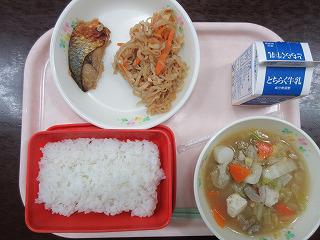 久々のかるちゃんランチです。献立は「ごはん、牛乳、サバのカレー醤油焼き、切り干し大根煮、豚汁」です。