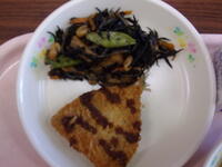 今日の給食の献立は、ごはん、牛乳、アジフライ、五目煮、みそ汁です。