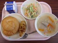 今日の給食の献立は、バターロール、牛乳、コーンコロッケ、マカロニサラダ、チャンポンスープです。