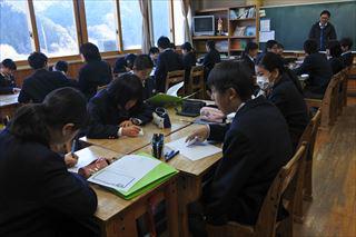 粟野中学校の学区は広く、さまざまな地区から生徒が通っています。そのことから、総合的な学習の時間では、他の地区に住んでいる生徒に向けて、自分たちの地区を紹介する「地域自慢」という学習を行っています。