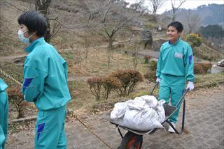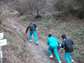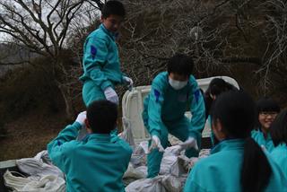 野生のイノシシが掘った穴を埋めるために、みんなで土嚢を山の斜面まで運びます。