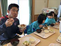午前中の活動でお腹ぺこぺこ。笑顔で昼食を食べていました。