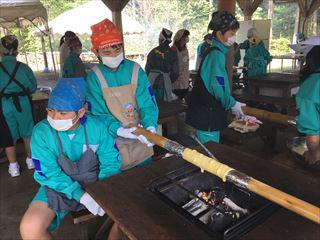 竹筒に生地を薄く塗り、焼いてはまた塗ることの繰り返しです。生徒たち根気強く実施しました。