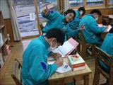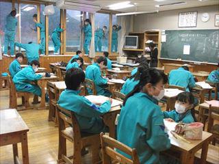 本日、植樹活動は雨天により延期になったため教室で窓ふきと卒業文集の作成が行われました。
