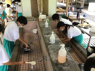 食事の後は使用した調理器具を丁寧に洗い、かまどの清掃を行います。