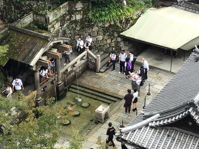 改修された清水の舞台に立ち、高校入試突破最後の神頼みしつつも、音羽の滝では、恋愛成就の水でお清めをしていました。