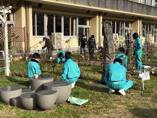 今年度、4回目のバラ管理作業が行われました。今回の主な作業は①つるバラの誘引作業と②バラの追肥作業(寒肥)の2つです。地域ボランティアの方々にはつるバラの誘引作業を、中学生ボランティアは追肥作業を行いました。来年の開花に向けて準備が始まりました。