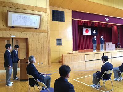 小学校とはまた違った新たな経験をし、たくさんのことを得て、勉強だけでなく、部活動や学級活動などにも積極的に取り組みたいと思います。私たち新入生一同は、粟野中学校の生徒として誇りをもち、一つ一つの行動に責任をもって何事にも一生懸命取り組み、充実した生活を送れるように心がけていきたいです。(一部抜粋)