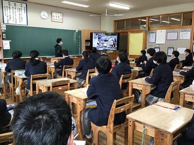 teamsにパワーポイントを画面共有しながら説明を行ったり、黒板に掲示したワークシートを共有したり、テレビにミラーリングして生徒と共有するなど、先生方は試行錯誤をしながら工夫していました。生徒達も真剣に授業に取り組んでいました。teamsに入れなく戸惑った生徒もいて課題は多いのですが、非常事態がおきても学びを止めないことの練習ができました。