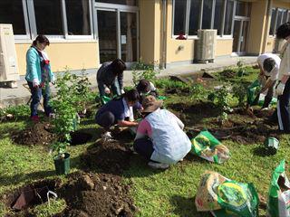 校舎前の芝生花壇が、クローバーで覆われてきていたため、バラを植え、明るい雰囲気にしたいと思いました。これから株が大きくなり、花が咲きほこるのが楽しみになりました。