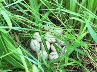 草刈りの途中、校庭の一角で、カモの卵を発見しました。産卵し、温めているものと思われます。その一角は草刈りをせず。雛がかえるまで大切に見守っていこうと思います。