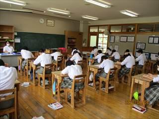 教室での授業風景です。教室の広さには限りがありますが、机の配置を工夫し隣との距離が最大になるように配置して授業を進めています。マスクを着用し1m20cm~30cm以上の距離を確保できるように机の位置を配置してあります。