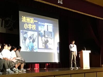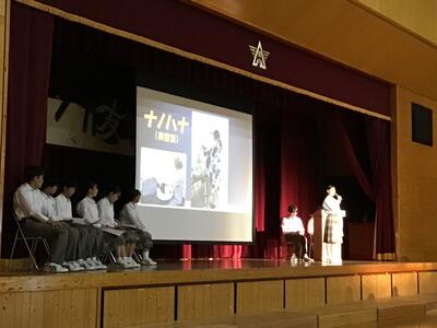 マイチャレンジ体験で取り組んだことを発表しました。11人で、生徒役と先生役などの役割分担し発表しました。