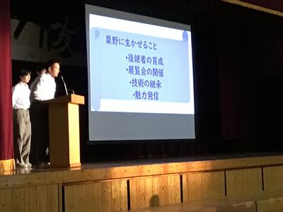 最後に、修学旅行で学んだことを、粟野地区でどのように生かしていくかを考えて発表しました。粟野地区のためにとても考えていることがわかりました。