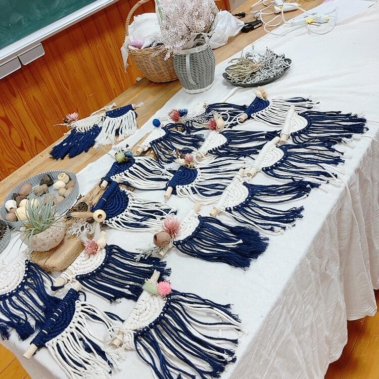 紐で編み込んでいくため難しく、何度も講師の方に丁寧に教えてもらい作品を完成させました。最後にマクラメタペストリーに飾りをグルーガンでつけました。