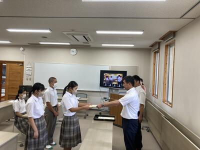 夏休み中に頑張った結果を表彰しました。部活動の県大会での活躍について表彰がありました。